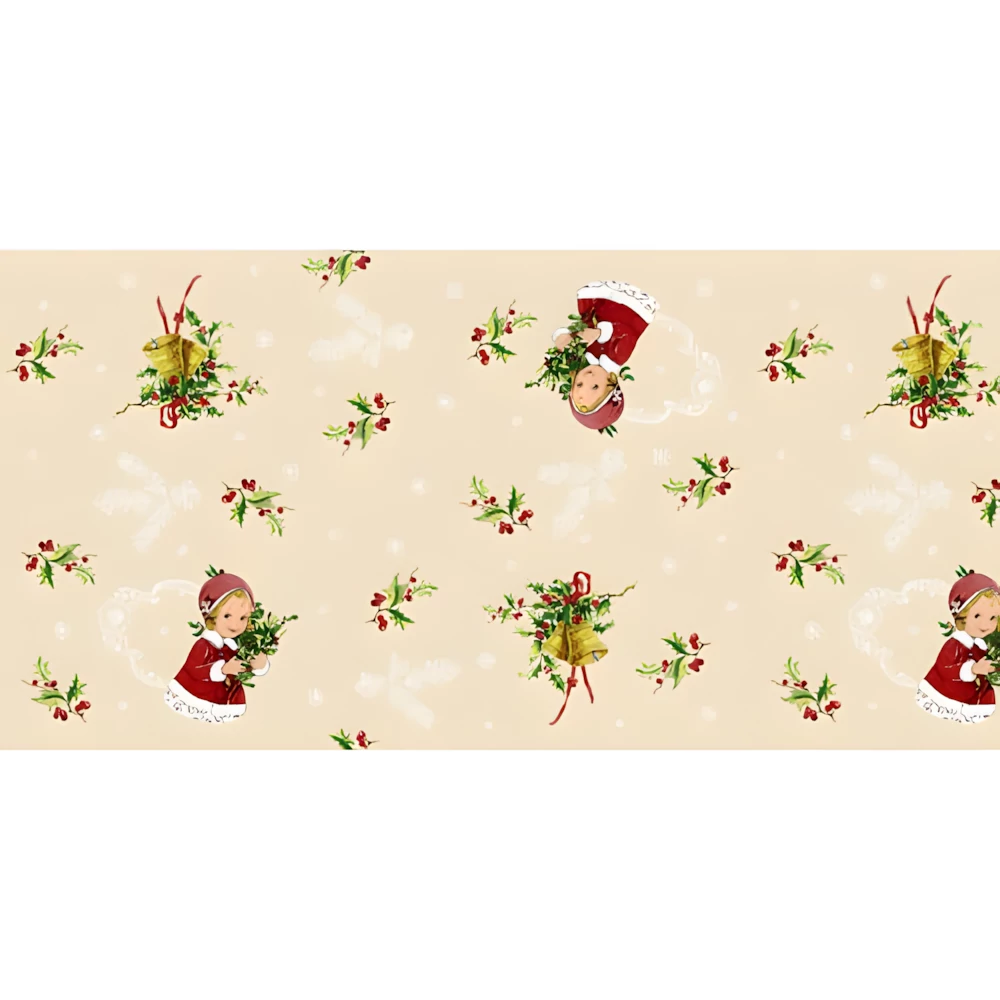 Mintázatát a bézs alapra festett karácsonyi motívumok teszik különlegessé: aranyszínű harangok, piros ruhás figurák és bogyós ágacskák, amelyek nosztalgikus és meghitt hangulatot varázsolnak a terítékbe. A textilhatású anyag lágy tapintása és elegáns megjelenése egyszerre teszi otthonossá és ünnepivé az asztalt.