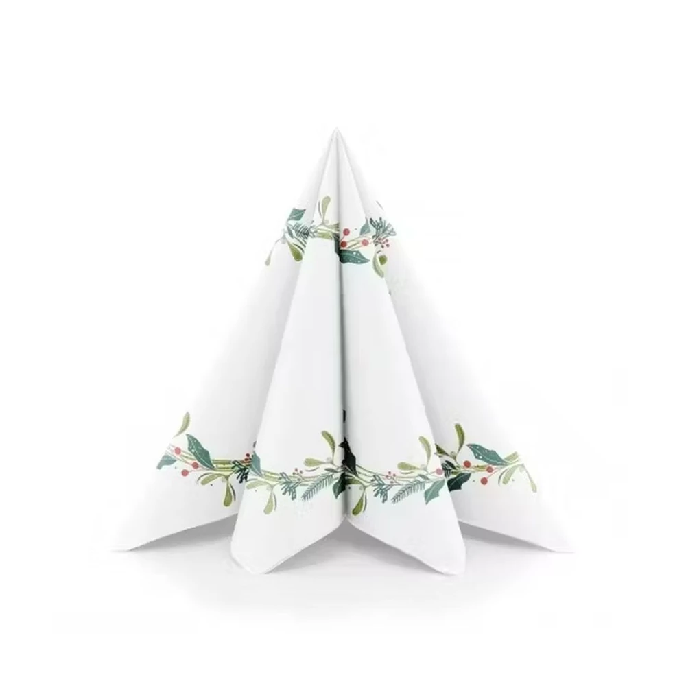 A 40×40 cm-es méret lehetőséget ad arra, hogy különféle szalvétahajtásokkal dobd fel a terítéket – legyen az ünnepi csúcsforma, elegáns álló hajtás vagy egyszerűbb megoldás. A koszorú motívum minden elrendezésben jól mutat, és harmonikusan illik zöld, piros vagy arany asztali dekorációkhoz.
