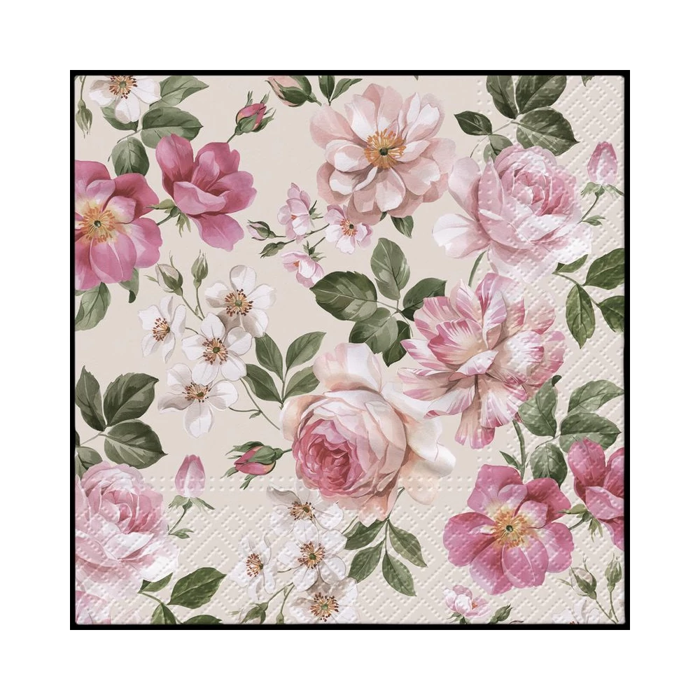 „A Rózsák pompája" rózsás mintás papírszalvéta tökéletes alapja egy elegáns asztaldekorációs koncepciónak.